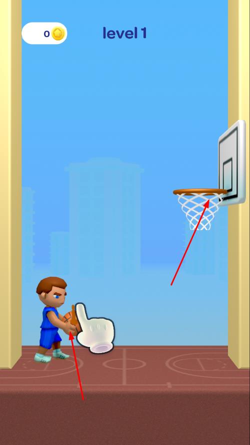 1、進(jìn)入后,在第1關(guān)界面,點(diǎn)擊籃球,調(diào)整投籃方向,將球投向籃筐。