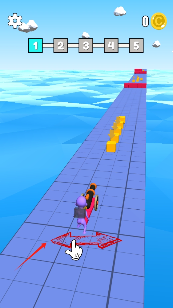 1、在關(guān)卡界面,滑動屏幕,控制角色左右移動,收集賽道上的金幣,避開障礙,點擊開始游戲。
