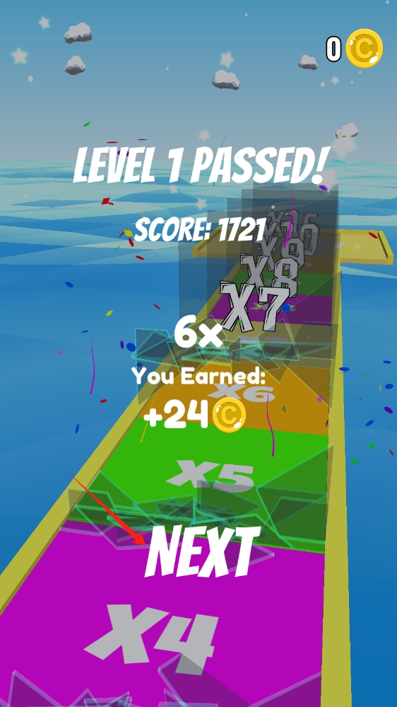 3、關(guān)卡通過后,點擊NEXT,進入下一關(guān),繼續(xù)挑戰(zhàn),爭取更高得分和更多金幣,提升人物能力。