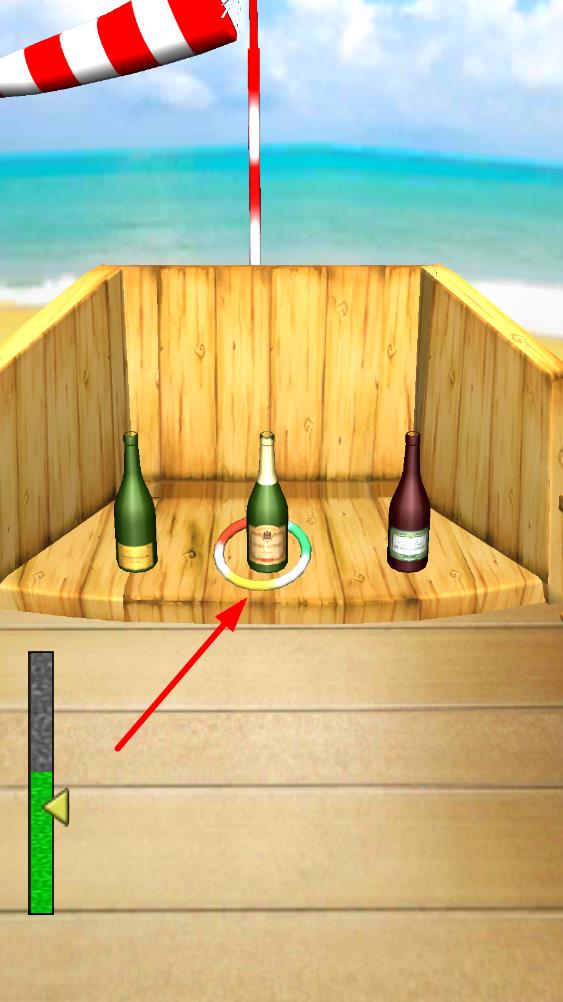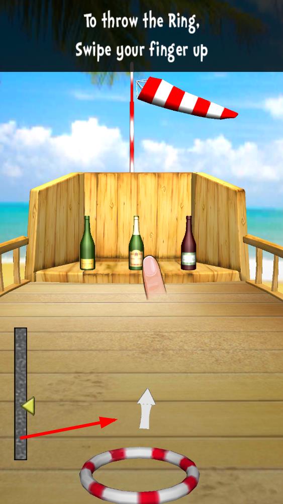 2、觀察屏幕中的瓶子位置和風(fēng)力提示,點擊屏幕向前滑動控制圈圈發(fā)射的力度和方向,嘗試套中目標(biāo)。