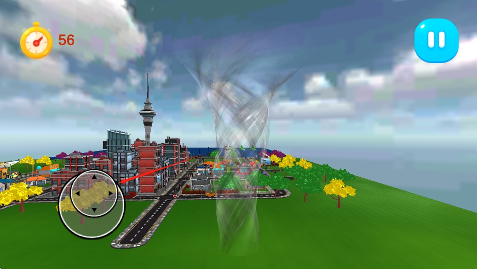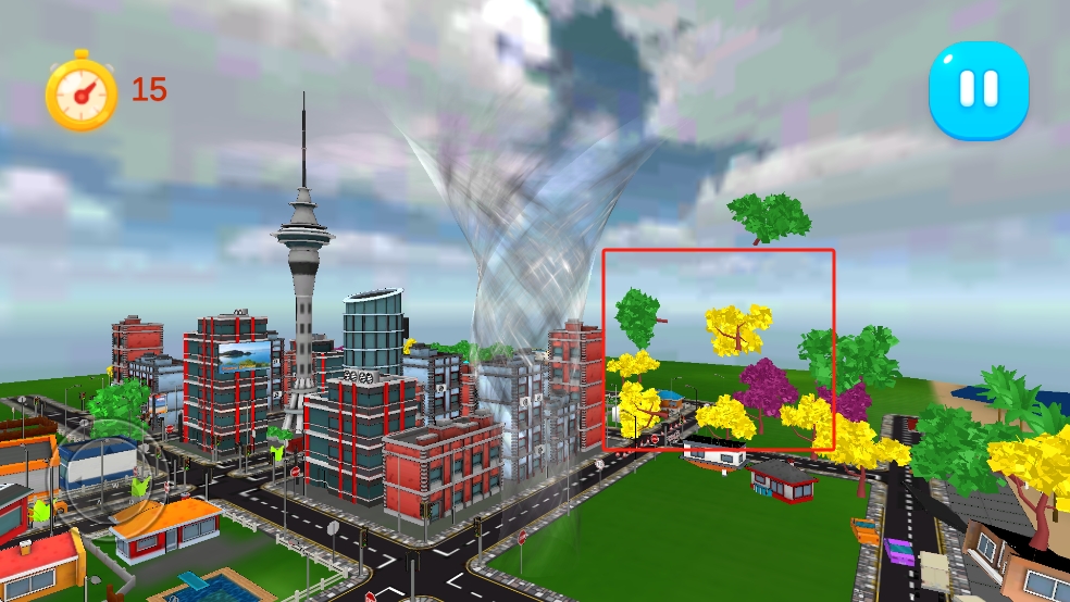 2、倒計(jì)時(shí)剩15秒時(shí),龍卷風(fēng)卷著樹木,快速操作搖桿,讓龍卷風(fēng)靠近城市的設(shè)施,引導(dǎo)被卷物體砸向建筑。