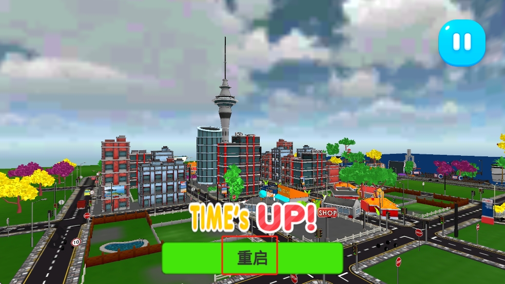 3、完成當(dāng)前城市的破壞模擬后,會(huì)顯示時(shí)間到了,點(diǎn)擊綠色的重啟按鈕,可以重新開始本關(guān)。