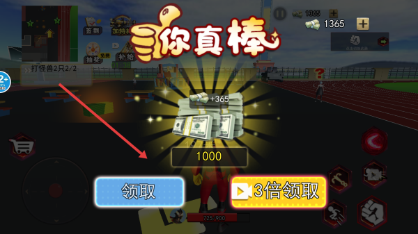 3、完成任務(wù)彈出獎(jiǎng)勵(lì)界面,點(diǎn)擊領(lǐng)取獲取金幣,如+365,用于強(qiáng)化角色、解鎖道具,延續(xù)挑戰(zhàn)。