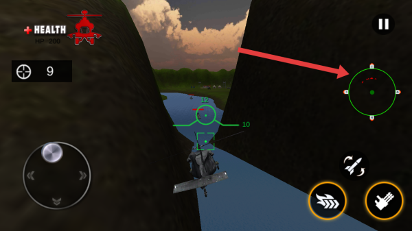 2、可以選擇查看右側(cè)MAP地圖,定位敵方目標方位,依據(jù)地圖指引駕駛直升機尋找紅點殲滅敵人。