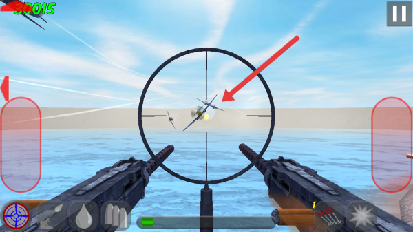 2、瞄準(zhǔn)空中的敵機,點擊中間直接進行射擊攻擊目標(biāo),點擊右下角可以使用其他的武器殲滅敵人。