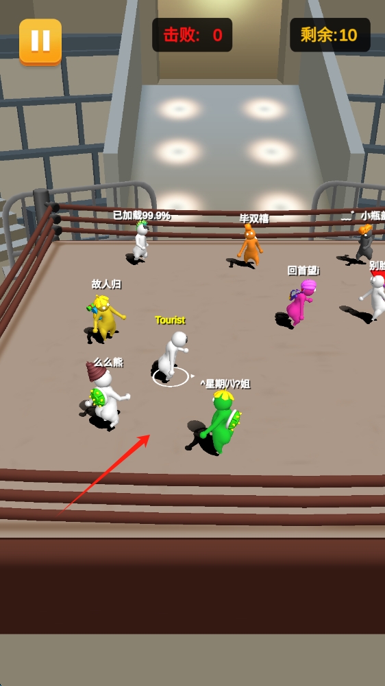 1、啟動游戲后,點(diǎn)擊開始游戲,進(jìn)入戰(zhàn)斗場景,操控角色在拳擊場靈活移動,躲避其他角色攻擊。