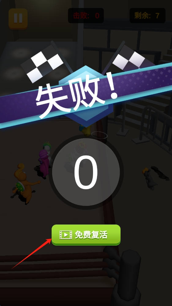 3、若戰(zhàn)斗失敗,點(diǎn)擊免費(fèi)復(fù)活,觀看廣告后重新加入戰(zhàn)斗,繼續(xù)挑戰(zhàn),爭取獲得勝利。