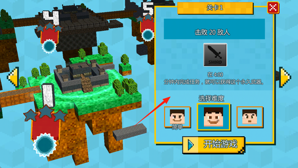 1、選關(guān)卡1,目標(biāo)擊敗20敵人,4分鐘內(nèi)完成得永久武器,選難度如普通,點(diǎn)開始游戲。