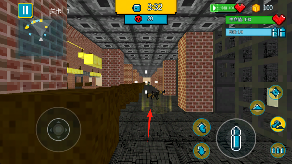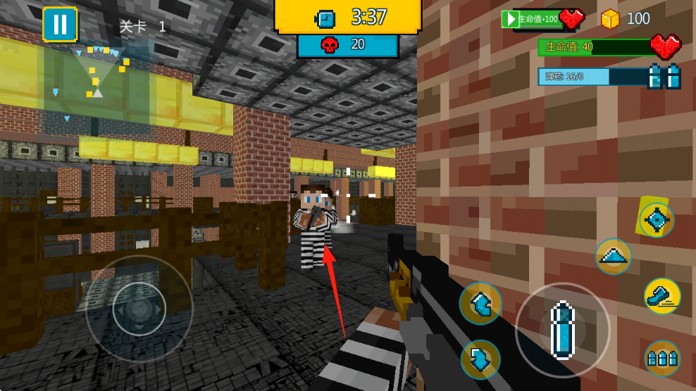 2、進(jìn)入像素場景類似監(jiān)獄工廠,用左側(cè)搖桿移動(dòng),右側(cè)按鈕射擊、換彈,沿箭頭找敵人。