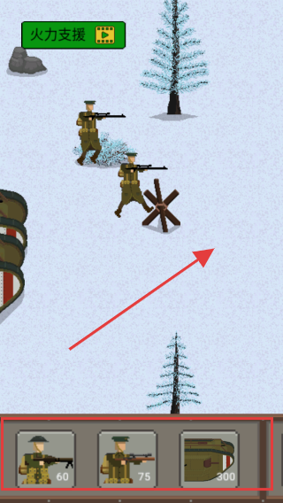 3、利用紅色方框內(nèi)的虛擬按鈕召喚士兵,完成游戲任務(wù),獲取游戲得分和獎(jiǎng)勵(lì),積累游戲資源,提升角色的能力。