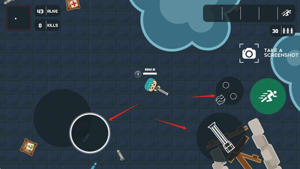 1、進(jìn)入游戲場(chǎng)景,操控角色移動(dòng),利用右側(cè)按鍵調(diào)整武器與移動(dòng),靠近黑色區(qū)域等資源點(diǎn),拾取物資武裝自己。