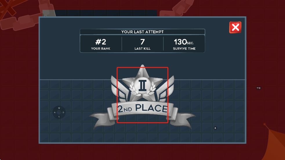 3、本局結(jié)束后,查看排名為第2名,記錄存活時(shí)間130秒、最后擊殺數(shù)7,點(diǎn)擊關(guān)閉按鈕,可開啟新一局挑戰(zhàn)。