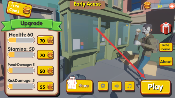 1、在游戲初始界面中,依靠箭頭的指引點(diǎn)擊黃色Play按鈕,進(jìn)入關(guān)卡選擇頁(yè)面開啟格斗冒險(xiǎn)之旅。