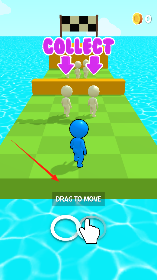 1、拖動屏幕控制藍色角色移動,在跑道上,收集白色小人壯大隊伍,向終點前進,體驗隊伍擴充機制。