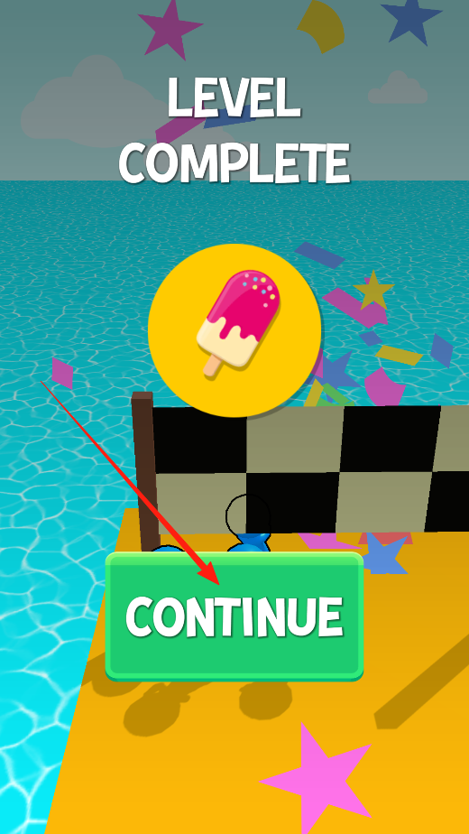 3、到達終點,點擊CONTINUE進入下一關(guān),面對新跑道布局,重復(fù)收集前進流程,體驗關(guān)卡推進機制。