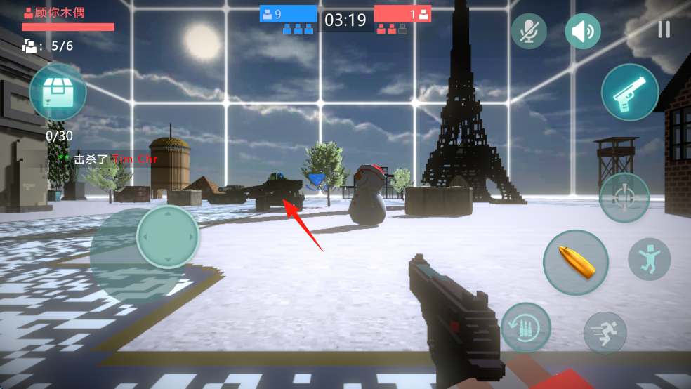 2、開局利用建筑掩體,收集武器如手槍,瞄準(zhǔn)敵人敵方玩家載具射擊,注意小地圖與隊(duì)友配合。