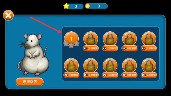 1、皮膚商店界面里,找到帶灰色星星標(biāo)識(shí)的1號(hào)老鼠皮膚,滿(mǎn)足解鎖條件后選定,配置外觀(guān)后返回關(guān)卡選擇列表。