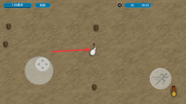 3、通過(guò)左側(cè)虛擬搖桿控制老鼠移動(dòng),躲避螞蟻等障礙,沿著場(chǎng)景路徑推進(jìn),收集目標(biāo)、完成關(guān)卡設(shè)定任務(wù)。