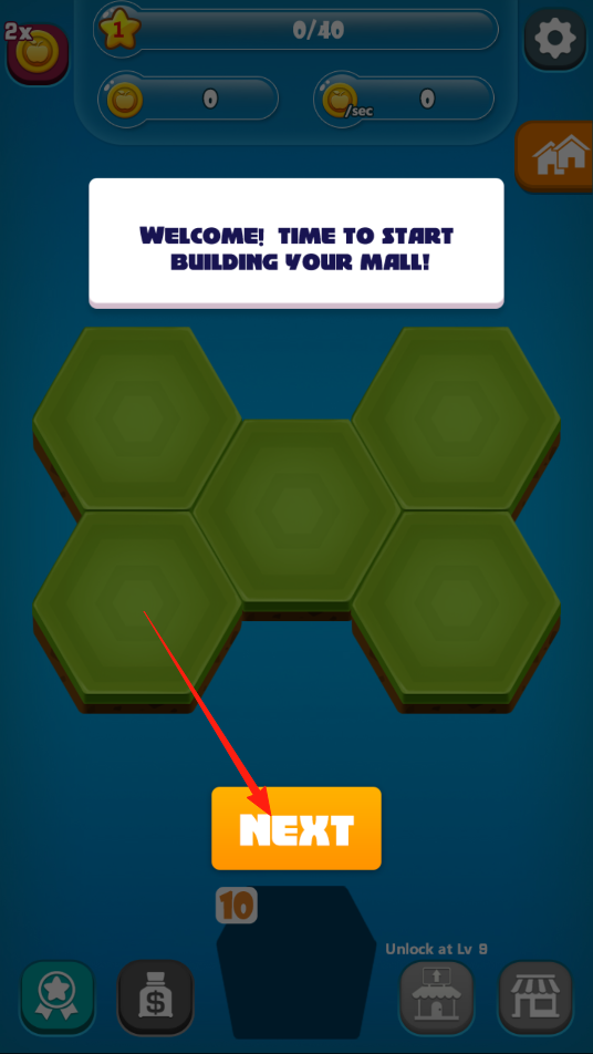 1、點(diǎn)擊NEXT推進(jìn)流程,開(kāi)啟商場(chǎng)建造進(jìn)入新環(huán)節(jié),準(zhǔn)備解鎖地塊,體驗(yàn)開(kāi)局推進(jìn)機(jī)制。