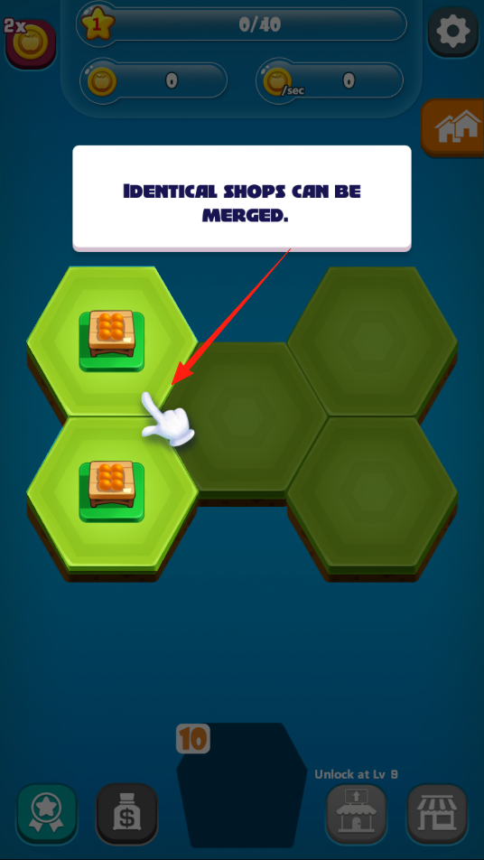 3、拖動(dòng)相同商店進(jìn)行合并,升級(jí)建筑,提升收益優(yōu)化商場(chǎng)布局,體驗(yàn)建筑合成機(jī)制。