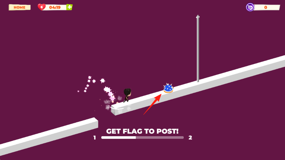 2、優(yōu)先收集藍(lán)色旗幟FLAG,靠近旗幟會自動獲取,集旗后向終點旗桿前進,注意避開尖刺等陷阱。