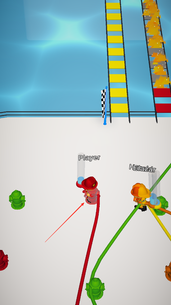 1、四位玩家各拿著一個(gè)水槍?zhuān)覀冃枰龅經(jīng)]有顏色的消防栓,將背后的水桶裝滿,背著水桶走上火梯滅火。