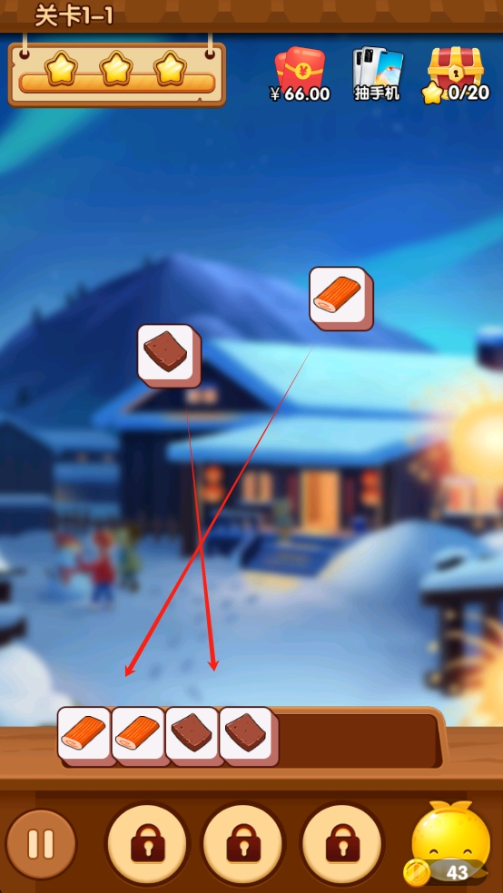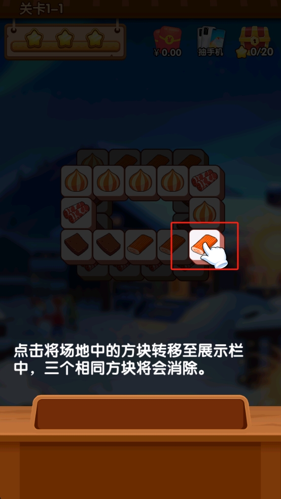 1、根據(jù)提示點擊場地里帶手指標識的方塊,把它移到下方展示欄,湊夠三個相同方塊就能消除。