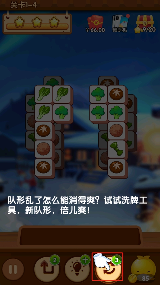 3、遇到隊形亂的提示,點擊下方帶數(shù)字3的洗牌工具按鈕,打亂方塊重新排列,創(chuàng)造更多消除機會。