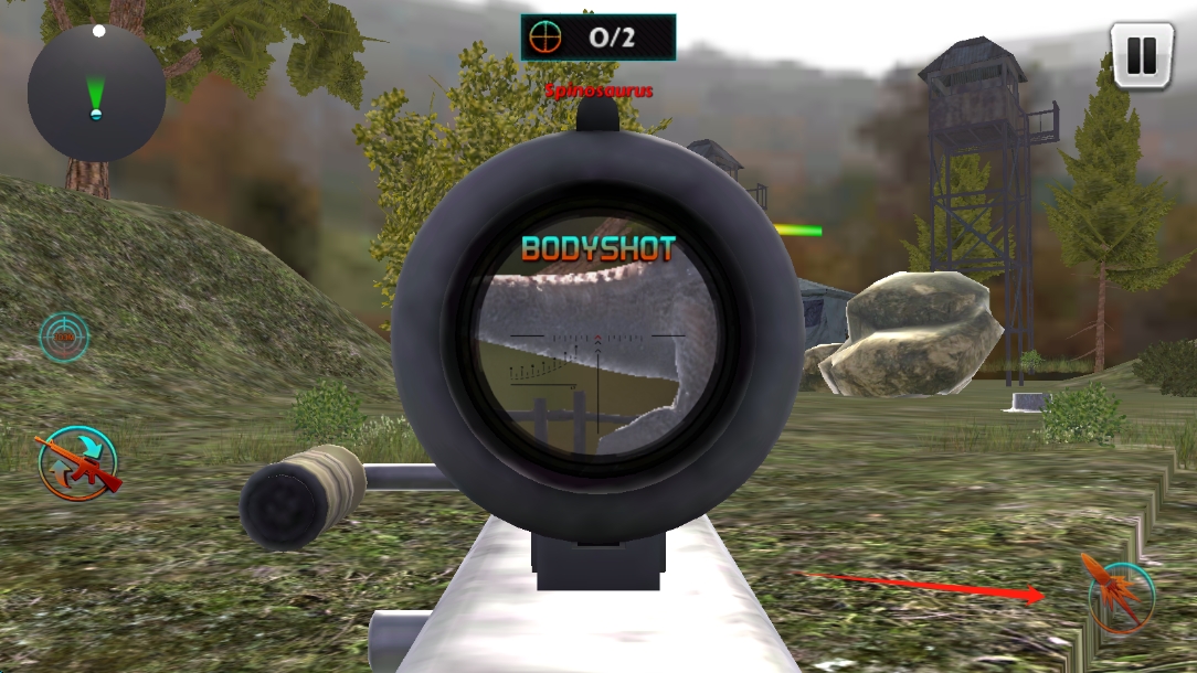 3、游戲中,操控狙擊槍,瞄準恐龍,精準射擊,爭取打出BODYSHOT,完成關卡任務。