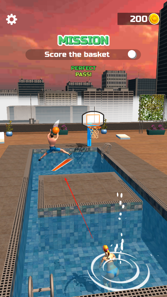 1、人物腳下有個(gè)大致方向,點(diǎn)擊屏幕后人物則會(huì)開始投籃,要在人物落水前丟進(jìn)籃球即可。