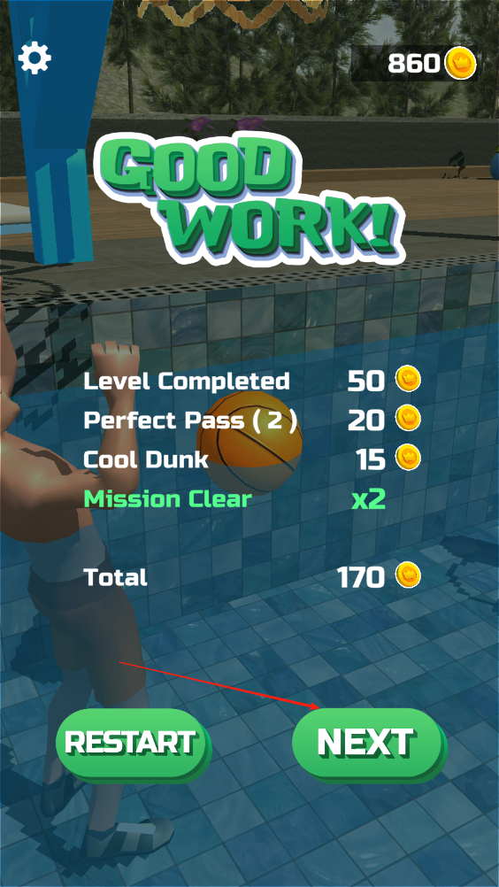 3、完成投籃任務(wù)后,會(huì)根據(jù)扣籃,傳球,以及進(jìn)球時(shí)間等進(jìn)行評(píng)分,以此獲取獎(jiǎng)勵(lì)來(lái)購(gòu)買籃球皮膚,泳池樣式,以及角色裝扮。