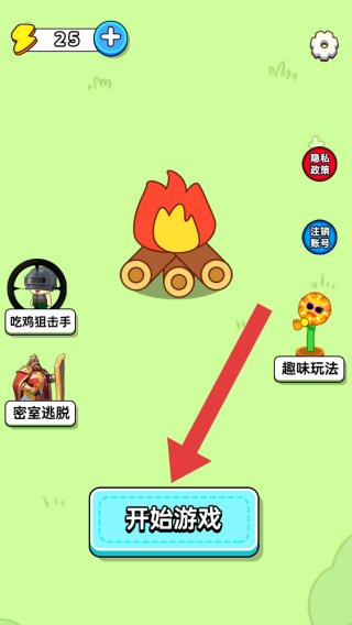 1、點(diǎn)擊開(kāi)始游戲的按鈕,還有吃雞狙擊手、密室逃脫、趣味玩法等模式選項(xiàng),屬于一款包含多種玩法的休閑游戲啟動(dòng)界面。