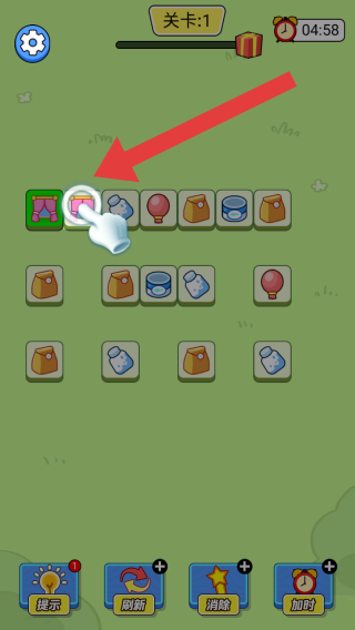 2、顯示關(guān)卡為1,剩余時(shí)間04:58,界面下方有提示、刷新、消除、加時(shí)等功能按鈕,玩家正操作點(diǎn)擊選中圖標(biāo)進(jìn)行消除操作。