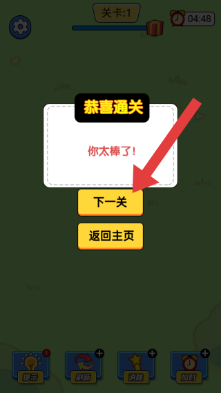 3、恭喜通關(guān)你太棒了!點(diǎn)擊下一關(guān)方可繼續(xù)游玩,表明玩家完成第1關(guān),可選擇進(jìn)入下一關(guān)或返回主頁(yè)。