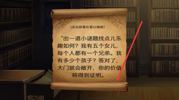 1、遇到謎題時(shí),需要分析五個(gè)女兒,每個(gè)有一個(gè)兄弟,可知兄弟是共同的,孩子總數(shù)為5+1=6,答對(duì)開(kāi)啟大門。