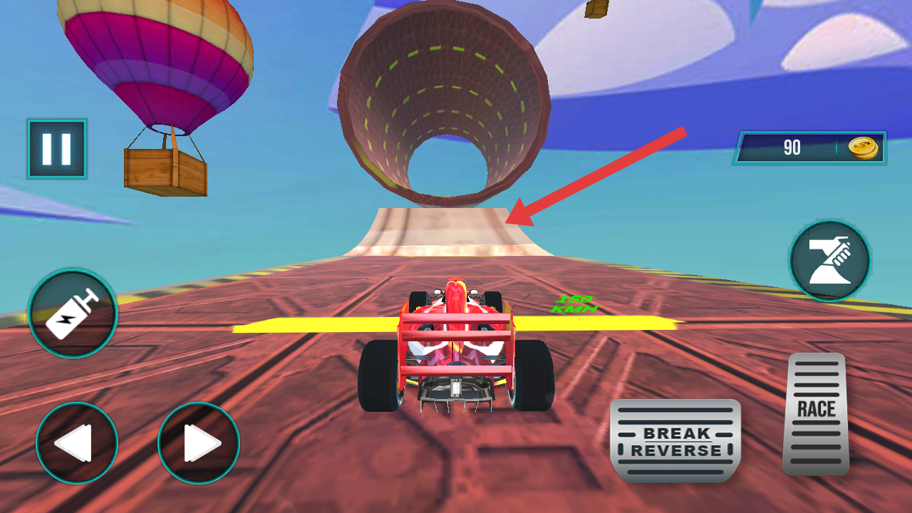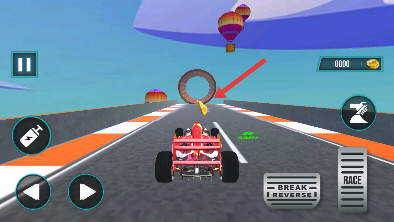 1、駕駛賽車沖向箭頭指向的環(huán)形裝置,在駕駛的途中還要收集地面上的金幣,可以用來(lái)升級(jí)賽車。