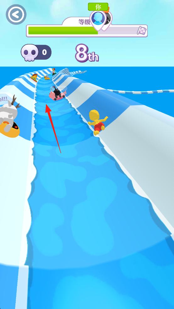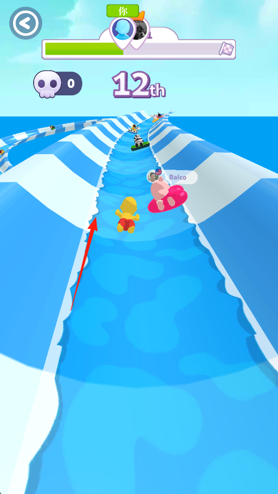 1、操控角色黃色小人等,在藍色水滑道,沿紅箭頭方向滑行,避開其他選手,提升排名從12th往前進。