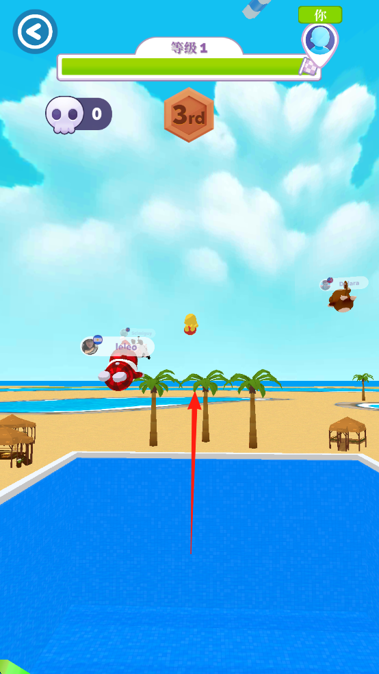 3、沖出滑道后,在空中沿紅箭頭方向,朝泳池跳躍,避開其他選手干擾,以3rd名次沖向終點,完成等級1挑戰(zhàn)。