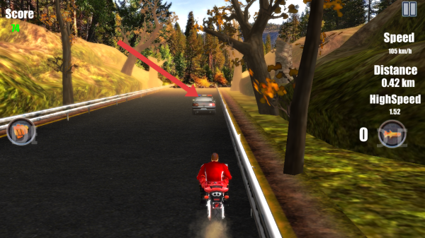 2、駕駛摩托車加速逼近箭頭指向的警車,需要嘗試超越或躲避,如果不小心撞尾了則游戲失敗。