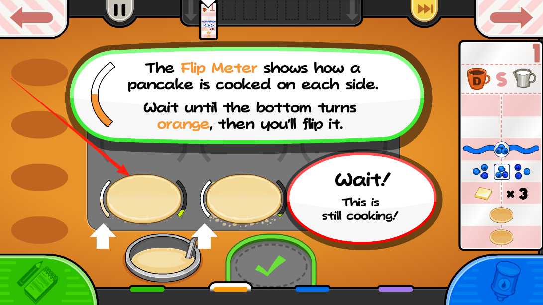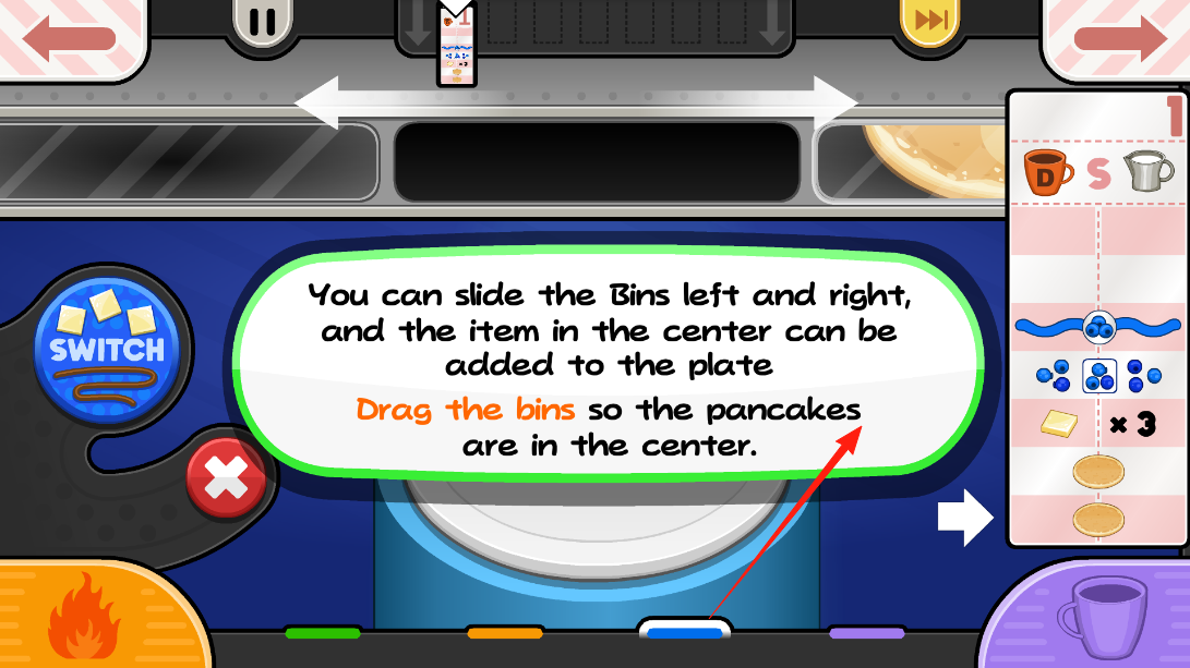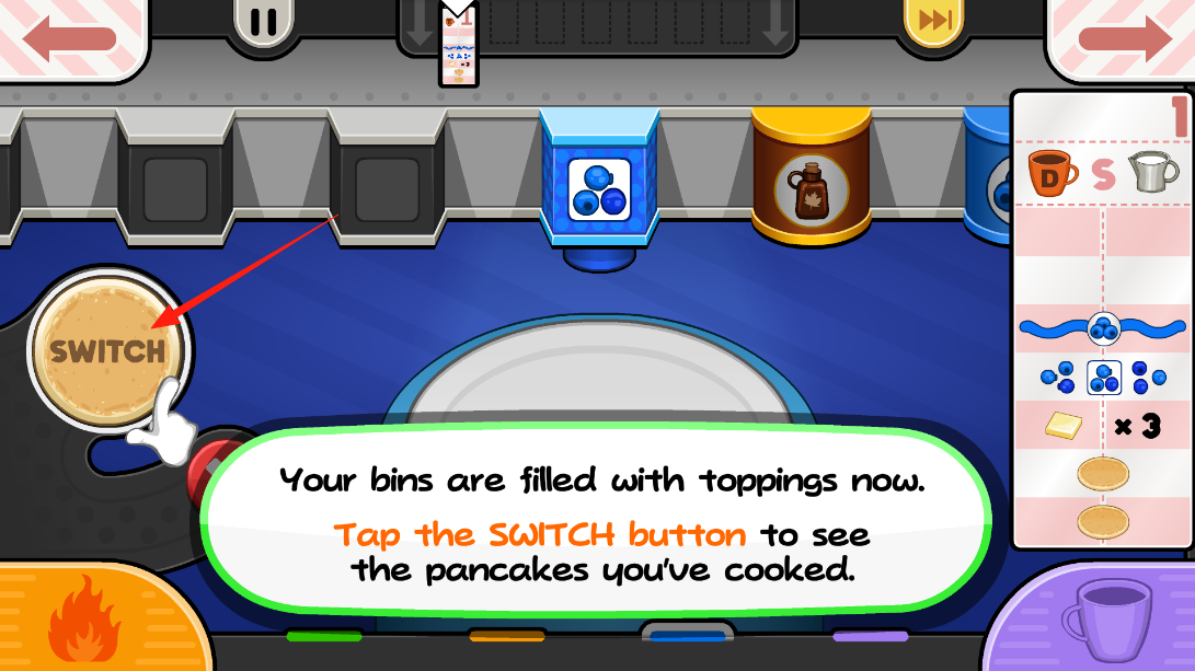 2、點(diǎn)擊SWITCH按鈕,切換至已烹飪煎餅的查看界面,此時(shí)料箱填充配料為后續(xù)裝飾流程鋪路,體驗(yàn)界面切換的交互設(shè)計(jì)。