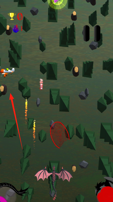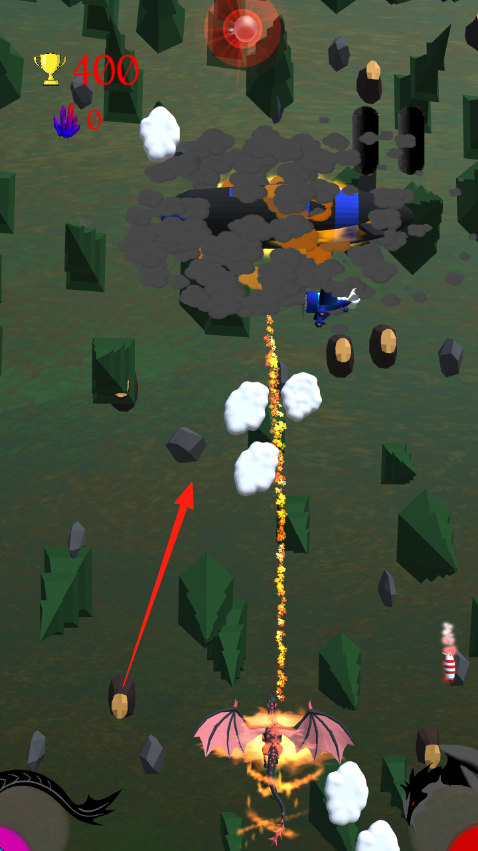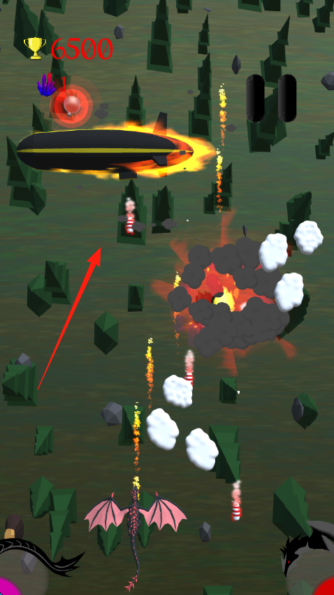 1、操控飛行單位如飛龍等,沿紅箭頭方向飛行,躲避石塊、煙霧等障礙,攻擊敵人。