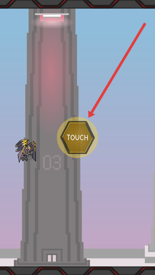 1、按照箭頭方向點擊畫面中金色TOUCH按鈕,觸發(fā)游戲機制,使角色進入平臺跳躍挑戰(zhàn)階段。