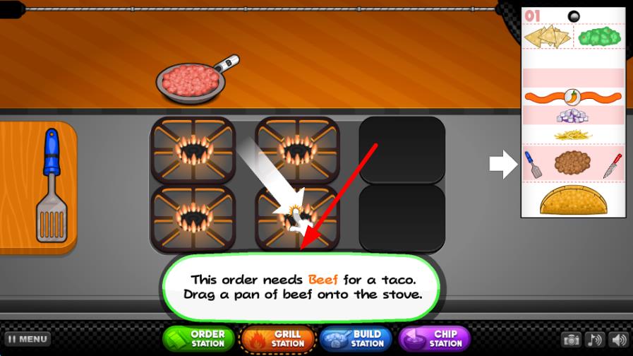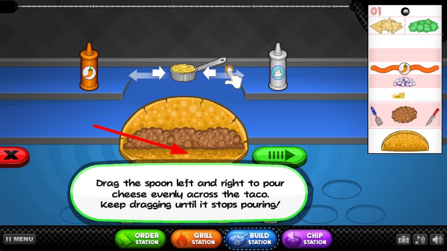 1、進入游戲后,熟悉操作臺的各個區(qū)域,根據(jù)首位客人的訂單,選取玉米餅、肉類等基礎(chǔ)食材,按步驟制作簡單的塔可,完成后交給客人獲得第一筆收入。