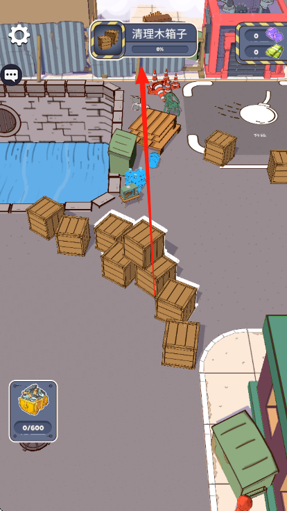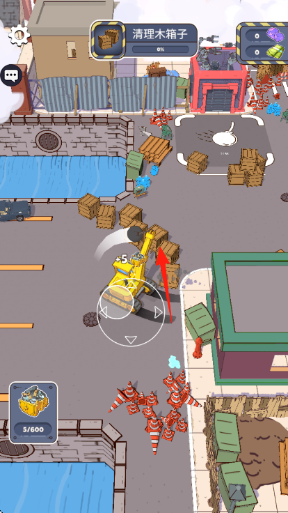 2、操作挖掘機,對準木箱,按提示清理,積累進度如從0/600到5/600,完成清理木箱子任務。
