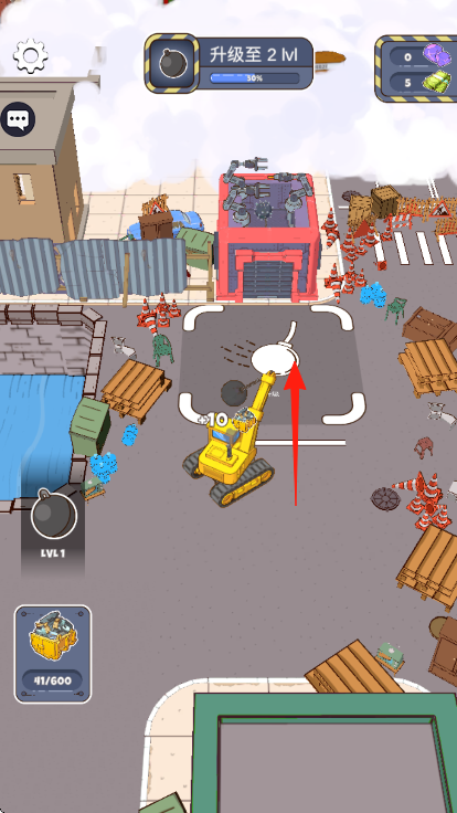 3、任務推進后,解鎖新目標如升級至2M,操控挖掘機沿紅箭頭,前往新區(qū)域,繼續(xù)清理、升級。