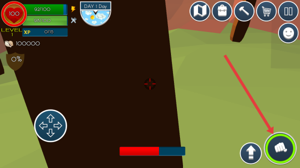 3、操控角色靠近樹(shù)木后,可以按照箭頭提示,點(diǎn)擊右側(cè)拳頭按鈕,執(zhí)行砍樹(shù)操作,獲取資源。