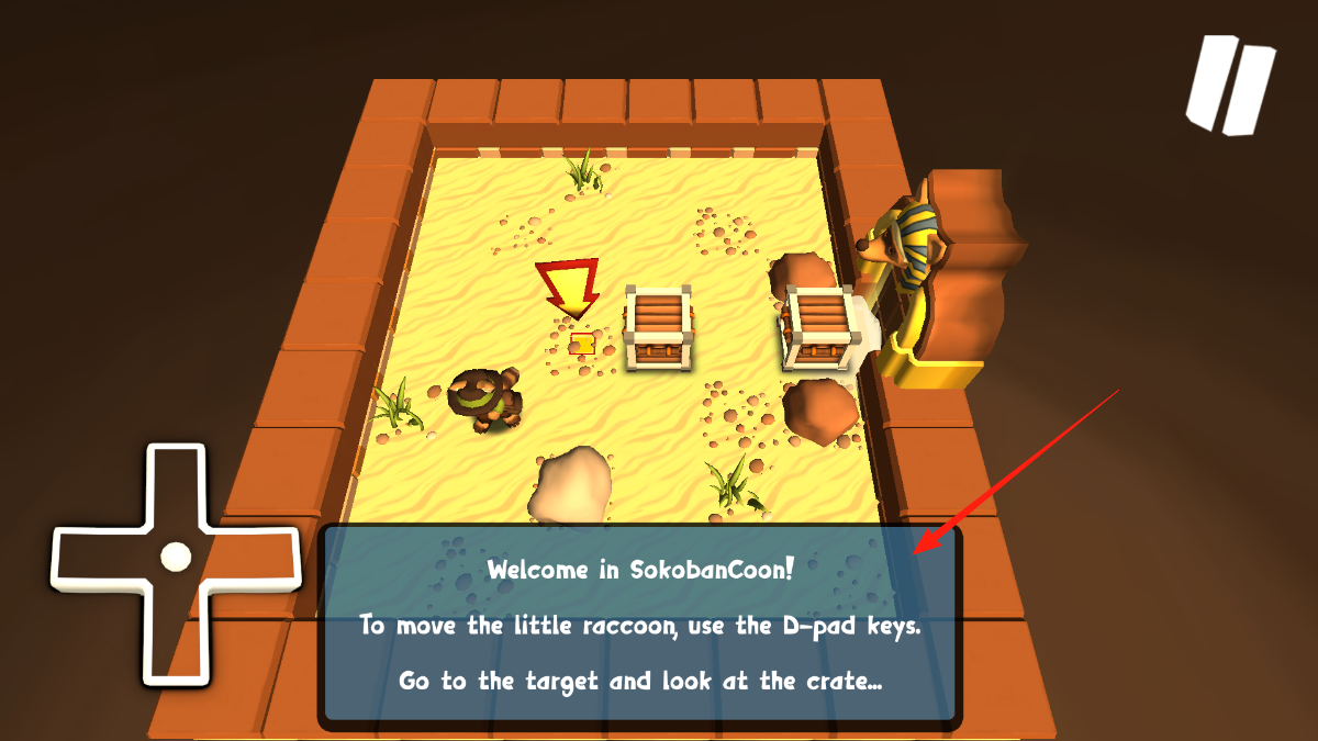 2、進(jìn)入SokobanCoon場(chǎng)景后,依據(jù)提示用方向鍵移動(dòng)小浣熊,通過(guò)操控方向鍵,讓浣熊抵達(dá)目標(biāo)位置同時(shí)留意木箱,為后續(xù)推動(dòng)木箱做準(zhǔn)備。