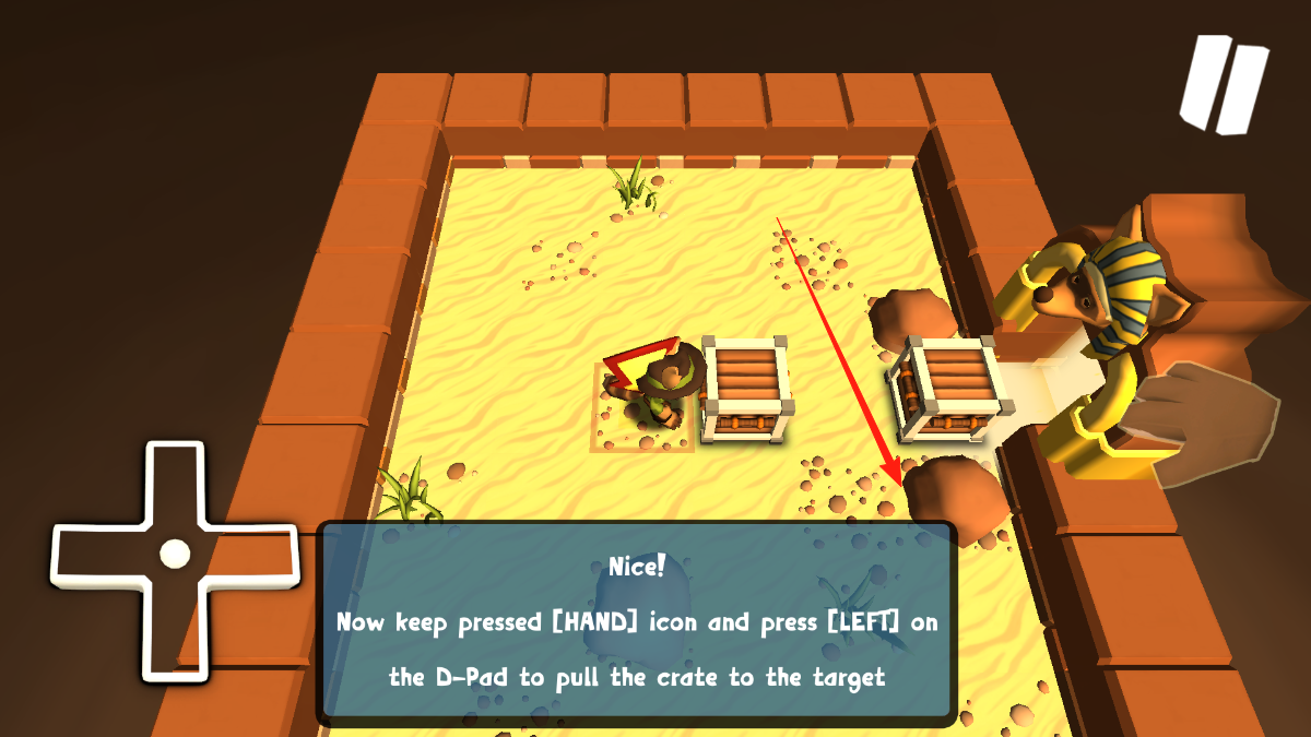 3、按指引長(zhǎng)按Hand圖標(biāo)并配合方向鍵左,拉動(dòng)木箱到目標(biāo)點(diǎn),此操作需精準(zhǔn)控制按鍵,利用交互機(jī)制推動(dòng)木箱完成關(guān)卡內(nèi)特定搬運(yùn)任務(wù)。