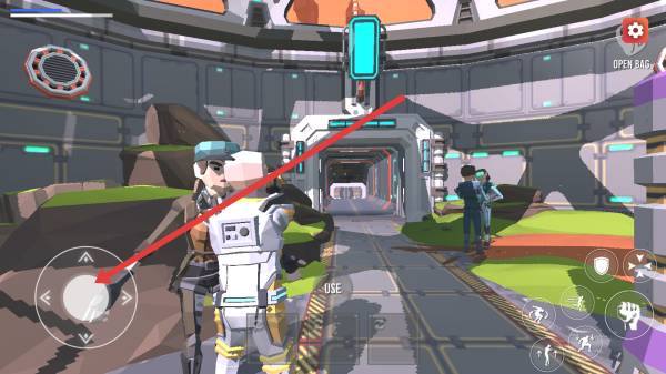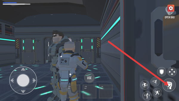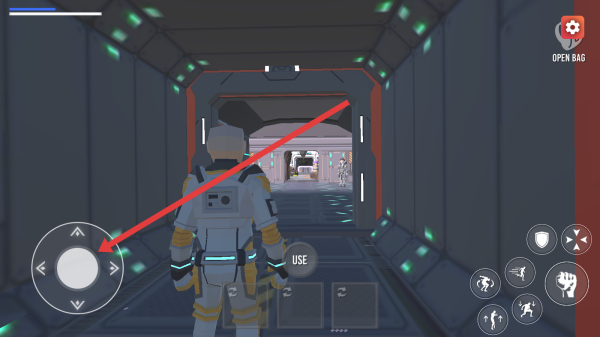 1、用左側(cè)搖桿控制移動(dòng),按箭頭指引方向,探索飛船走廊,靠近門互動(dòng)USE,進(jìn)入新區(qū)域。