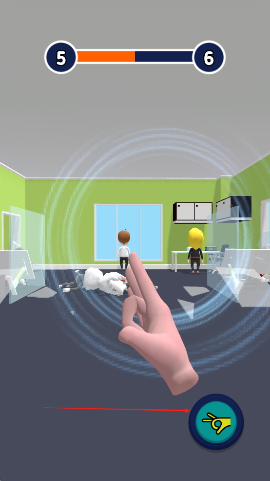 1、前方的小人會(huì)朝玩家跑來,在小人靠近玩家的那一刻點(diǎn)擊屏幕將小人擊飛,擊飛小人會(huì)增加右下角超能力的進(jìn)度條,滿了之后使用會(huì)擊倒范圍內(nèi)所有小人。